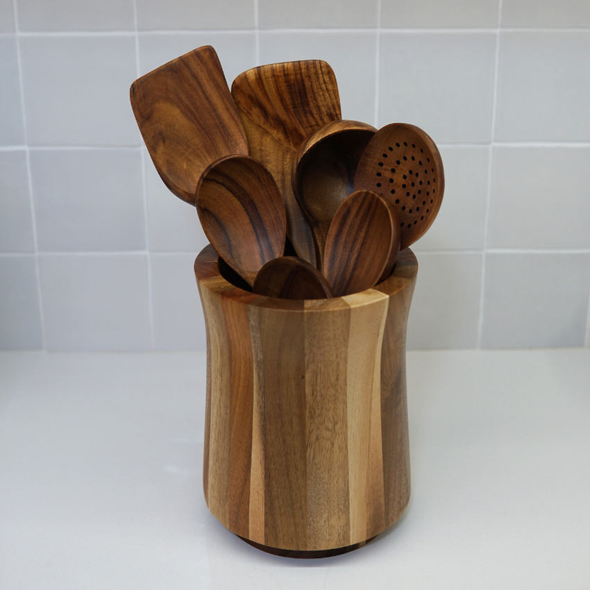 Keep your kitchen tidy and your favourite tools within easy reach with the 360° Wooden Utensil Caddy. Crafted from premium acacia wood, this elegant rotating holder is deep and spacious, making cooking more convenient while adding a warm, rustic touch to your bench.